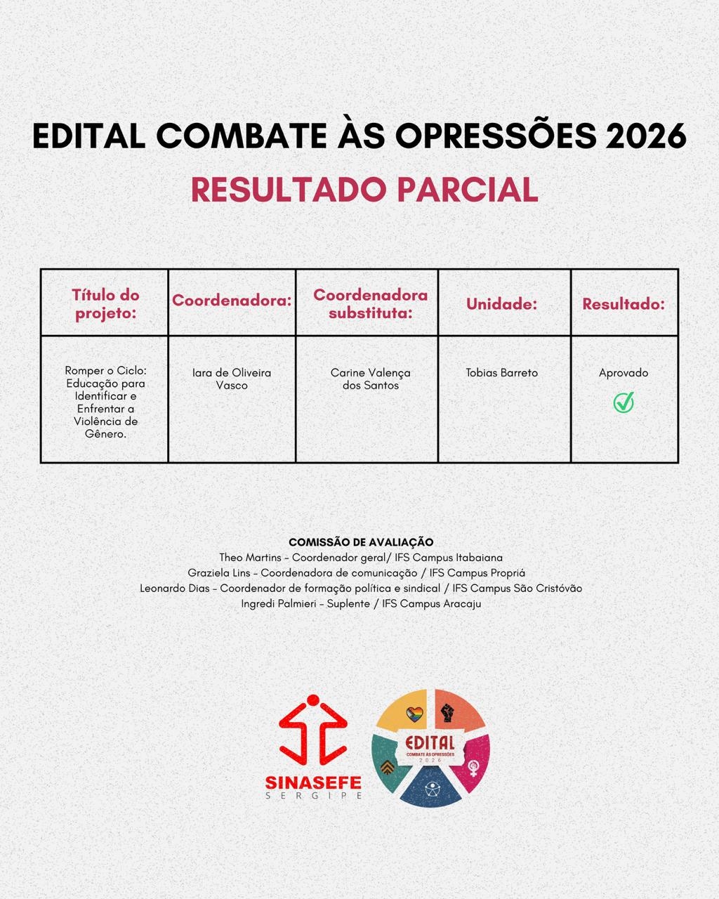 O Sinasefe Sergipe torna público o primeiro projeto aprovado no Edital de Combate às Opressões 2026, promovido por nossa entidade sindical.